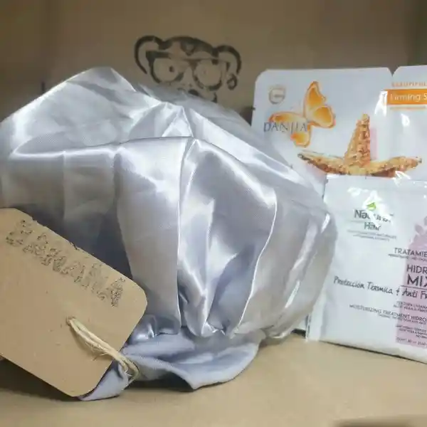 Sorprende con este esencial regalo incluye: 1 gorro en seda que ayuda a mantener la humedad natural del cabello y disminuye el frizz disponible unicamente en color plata, 1 mascarilla capilar Hidro Mix de natural Hair X 30gr y 1 mascarilla facial tipo velo de colageno marca Danjia x 36gr todo empacado en bolsa de papel kraft con logo Top banana tienda de regalos especializada y tarjeta con mensaje personalizado