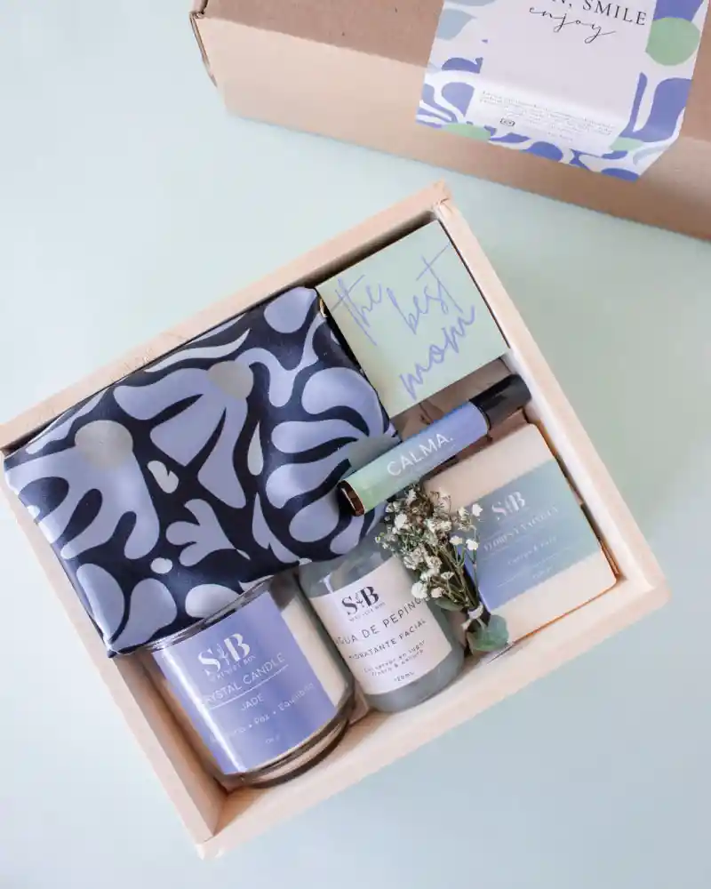 Este kit incluye: -Pañoleta en satín para diferentes usos -Vela aromática con piedras Jade para la paz y la tranquilidad -Tónico facial de pepino -Jabón de flores y vainilla -Roll on de aceites esenciales para la calma -Delicioso alfajor de arequipe -Caja de madera -Postal