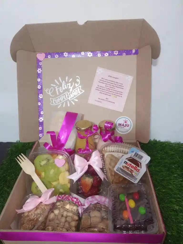DESAYUNO O MEDIA TARDE CON FRUTOS SECOS GALLETAS, CHOCOLATES,GRANOLA,TORTA PERSONAL CON VELITA,MIX DE FRUTA,FRESAS,WAFLE CON NUTELA,JUGO,YOGURT,SANDWIS