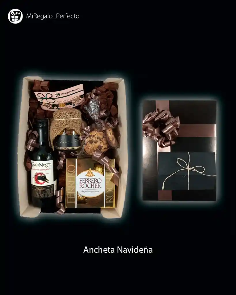 Regalo en caja de cartón, piba de vino tinto gato negro x187ml, Ferrero rocher x4U, botellita de cristal con frutos secos, galletas chips de chocolate, e incluye un accesorio que puede ser un llavero. Te incluye decoración a temática con cintas, moños y tarjeta personalizada.