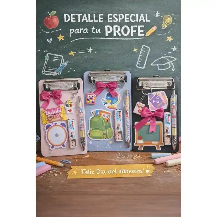 Regalo para el dia del Maestro - Tabla Decorada - Profesor contenido. 1 tabla de apoto con Clip 1 Boligrafo 1 llavero 1 post it 1 chocolate kinder 1 lazo decorativo 1 tarjeta