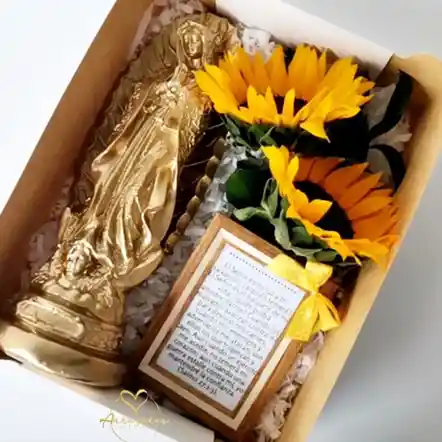 virgen chocolates girasoles o rosas tarjeta dedicatoria La imagen de referencia puede variar según el color de decoración y presentación disponibles. Puedes escribirnos y decirnos la ocasión Adiciones: - Globo burbuja marcado 15,000 - Arreglo floral 50.000 - Peluches desde 20.000