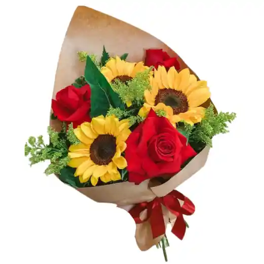 Ramo de 3 girasoles y 3 rosas rojas, con follaje variado, papel y moño