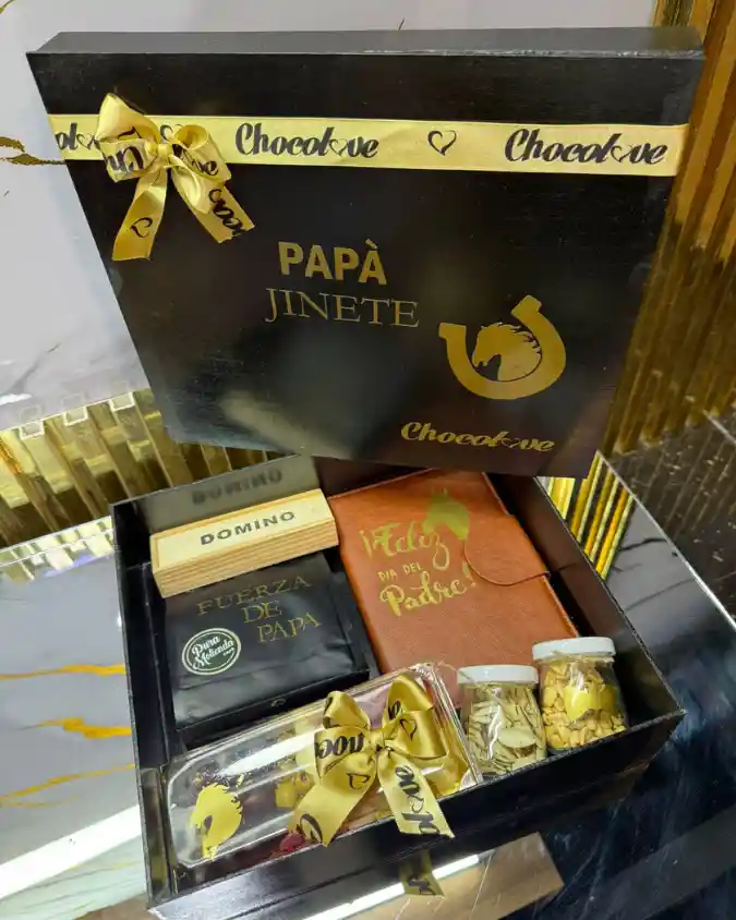 Caja de Madera con hermosos obsequios para sorprender al hombre de la casa ( mini tabla de quesos y frutas, mani, agenda en cuero paquete de cafe especial, un juego de domino pequeño)