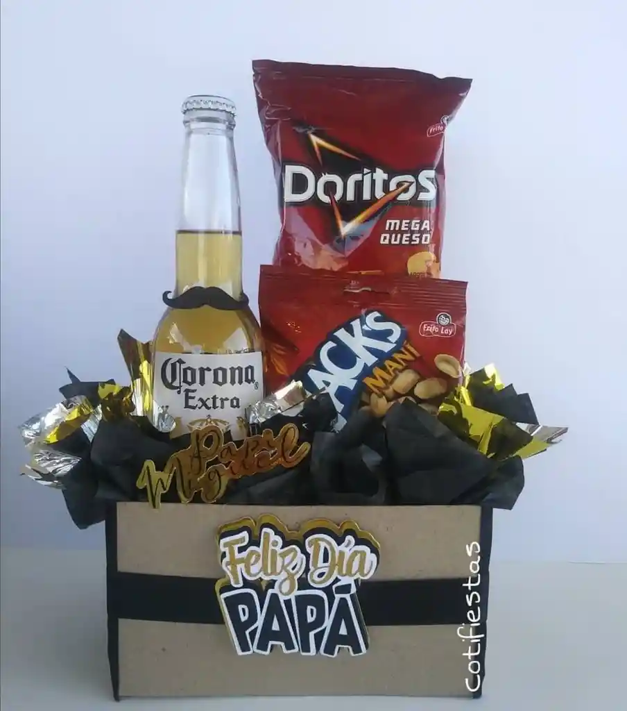 incluye: cerveza corona x1, papás surtidas x2 y decoración
