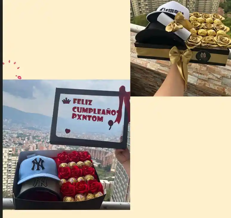 2 gorras de tu preferencia, (una vez realizado el pedido le enviamos catalogo de gorras) rosas eternas chocolates tarjeta dedicataria caja decorada personalizada La imagen de referencia puede variar según el color de decoración y presentación disponibles.