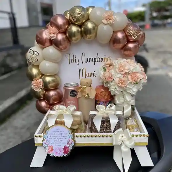 Contenido - Sándwich - Milo - Hatsu -bondyurt - Torta pequeña -Chocolates - Flores -Globos satinados -Tarjeta personalizada -Caja de madera Adiciones: - Globo burbuja marcado 15,000 - Arreglo floral 50.000 - Peluches desde 20.000