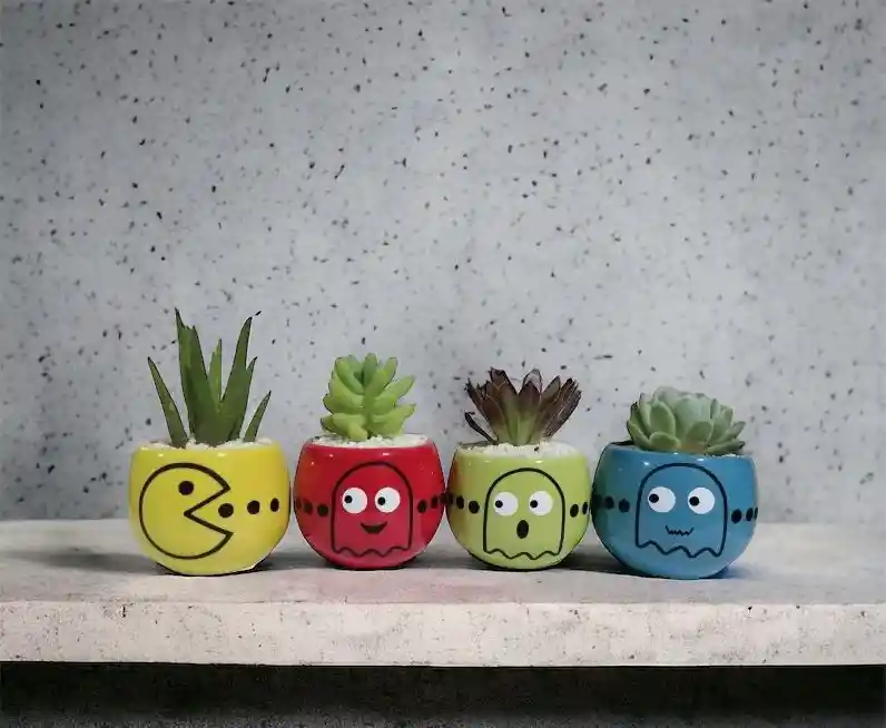 Set de Planta Suculentas 4 Unidades en Matera de Cerámica Con Diseño de Pac Man. Dimensiones 5 cm Alto. 5 cm Ancho. Incluye Bolsa de Regalo