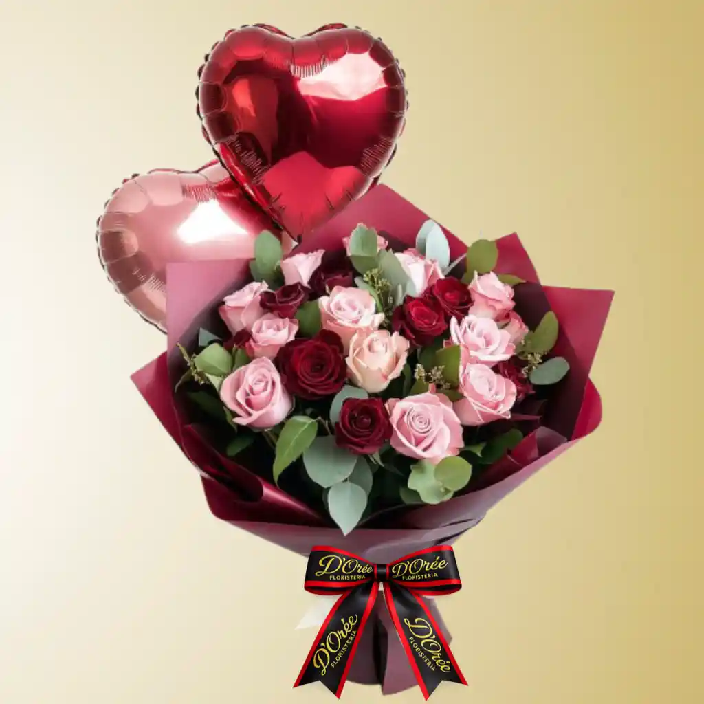 Un bouquet de 18 rosas bicolor envueltas en papel de seda, acompañado de 2 mini globos para un toque extra de encanto. (Nota: Imagen referencial. El color de las flores y los globos puede variar según disponibilidad.)