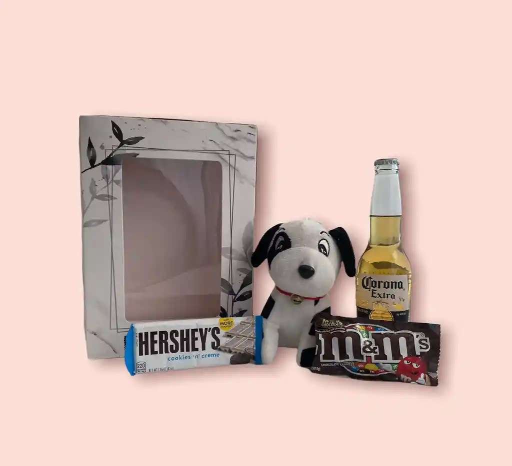 Regalale a esa persona especial este obsequio sorpresa. Contiene un oso en forma de perro, Una cerveza corona, Una barra de Hershey´s, Un M&M. Empacada en una linda caja.