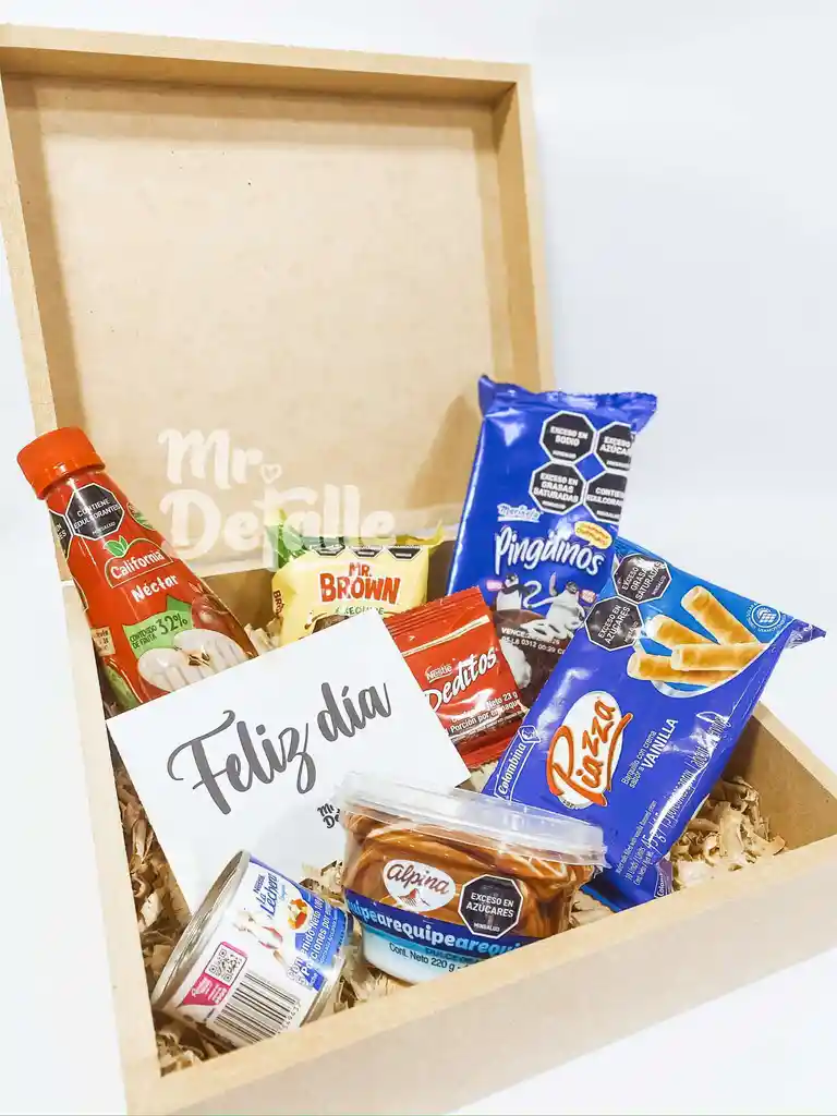 El Cofre Pekin incluye: 1 Jugo California, 1 Ponque Pingüinos, 1 Piazza, 1 Mr Brown, 1 Arequipe Alpina, 1 Lecherita, 1 Chocolates deditos, Cubiertos de madera, 1 tarjeta dedicatoria, 1 cofre con bisagras, 1 lazo decorativo por fuera del cofre. IMPORTANTE: *Por favor confirmar mensaje de la tarjeta dedicatoria por el chat de la orden, de no ser así, irá una tarjeta genérica. *Contemplar por favor el tiempo de elaboración del detalle ya que se realiza al momento de usted hacer el pedido y programarlo con anticipación.