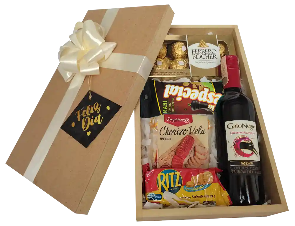 CAJA REGALO SPECIAL BOX 2 caja dura de MDF en crudo, Vino Gato negro 375ml, Ferrero x8-100g, Mani especial 40g, Chorizo Vela Madurado 40g( PARA ENVIOS NACIONALES, ESTE PRODUCTO SE REEMPLAZARA POR CABANO NO REFRIGERADO) Galletas Ritz 34g. Cinta, moño y tarjeta básica.