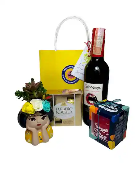 1 Suculenta Figura de Frida + 1 Gato Negro Vino Botella de 375 mL + 1 Ferrero Chocolates Caja de 50 g + 1 Vela Gel Aromatizada Con Mensaje Caja 85 g + 1 Tarjetita. Nos Dejas Las Palabras en Los Comentarios al Momento de la Orden Nosotros Enviamos el Mensaje