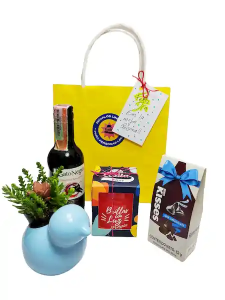 1 Suculenta Figura de Pollito + 1 Gato Negro Vino Tinto Botella de 187 mL + 1 Kisses Chocolates Caja de 32 g + 1 Vela Gel Aromatizada Con Mensaje Caja 85 g + 1 Tarjetita. Nos Dejas Las Palabras en Los Comentarios al Momento de la Orden Nosotros Enviamos el Mensaje
