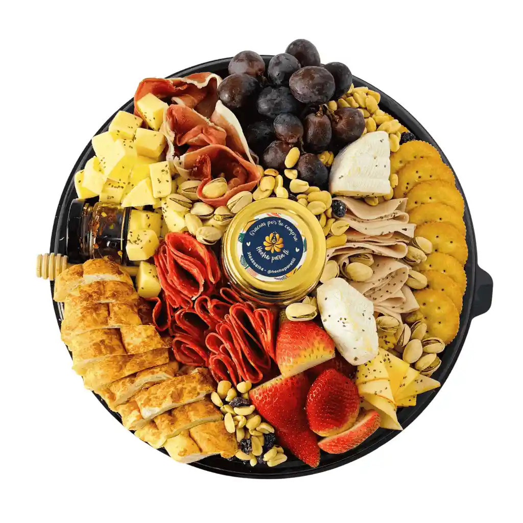 Una propuesta premium y deliciosa que equilibra sabores con estilo y buen gusto 🧀✨. Nuestra tabla de quesos con domo incluye una cuidada selección de 4 tipos de jamones, 3 variedades de queso, 2 tipos de fruta fresca, panes y galletas artesanales, frutos secos, aceitunas, y un toque especial de miel natural 🍯 para realzar cada bocado. Todo va presentado sobre una base elegante con domo transparente, perfecta para regalar, compartir o disfrutar en cualquier celebración. Si nos envías tu mensaje, te obsequiamos una tarjeta personalizada 💌. REF: TQ01