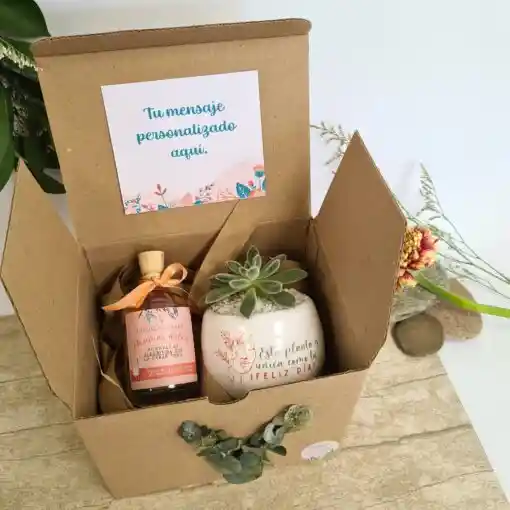 Incluye: Matera de cerámica con mensaje estampado predeterminado. Suculenta natural sembrada Caja de regalo. Tarjeta de cuidados Tarjeta de regalo con mensaje deseado Píldoras para mamas dulces (gomitas) Dimensiones: Matera y suculenta: Diámetro 7 cm x Alto 8.5 cm. Caja: 14,5 x 10 cm