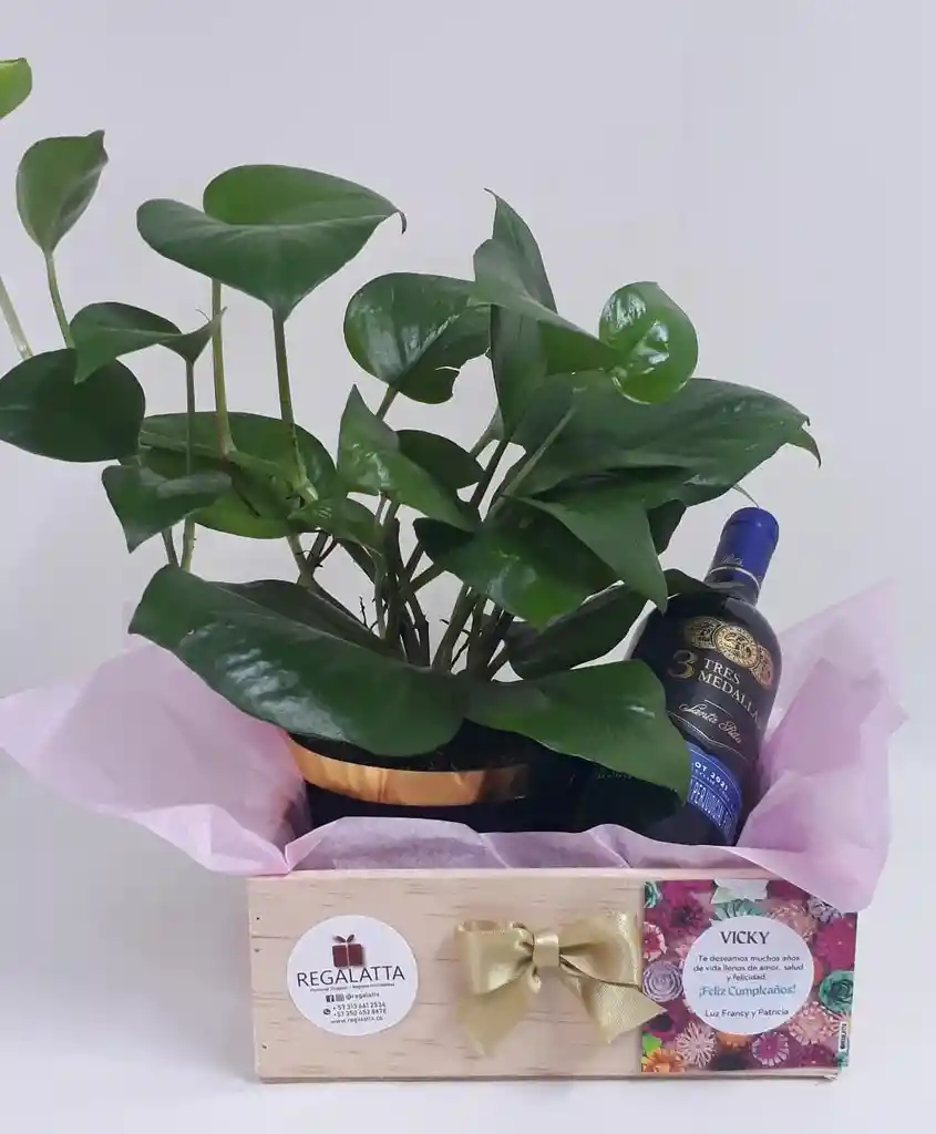 Ancheta con planta en matera de cerámica, vino, presentada en una caja de madera decorada con cinta y tarjeta.