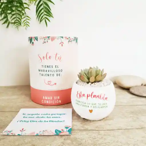 Celebra su fuerza, su amor y su delicadeza con un detalle que la representa: Incluye: Matera con suculenta sembrada con estampado predeterminado. Caja de regalo que se vuelve alcancía (Edición especial Madres) Tarjeta de cuidados de la planta. Dimensiones: Matera con planta: 6 x 9 cm Caja: 13 x 10 cm