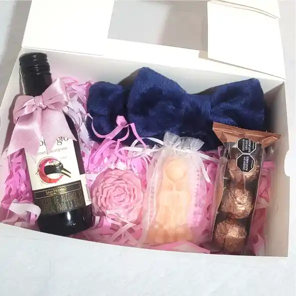 UNA DELICADA BOX QUE CONTIENE UNA HERMOSA BALACA EN PIEL DE CONEJO, VELITA AROMATIZADA DE LA VIRGEN DE GUADALUPE, JABON ARTESANAL DE FLOR, ACOMPAÑADO DE UNOS DELICIOSOS CHOCOLATES CON UNA BOTELLA DE VINO PICCOLO GATO NEGRO. EMPAQUE EN CAJA CON MOÑO Y TARJETA (NOTA: - LOS COLORES DE LA BALACA Y LA VELA PUEDEN VARIAR SEGÚN DISPONIBILIDAD)