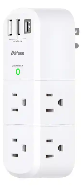 Marca: Mifaso Color: Blanco Total de tomas de corriente: 6 Voltaje: 125 Voltios Toma de pared USB 9 en 1: 6 divisores de salida de CA (3 lados, 15A/125V/1875W) con protector de sobretensiones integrado de 1800 julios y 3 puertos de carga USB (1 USB C, salida total CC 5V/3.1A), enchufe de CA giratorio de 180 grados. La luz indicadora con conexión a tierra que asegura que tus dispositivos estén seguros. Puertos de carga inteligentes USB- C: con tecnología IC inteligente integrada, los puertos USB de alta velocidad detectan automáticamente los dispositivos de carga y ofrecen una velocidad de carga óptima, USB A de hasta 2.4A/5V por puerto, USB C hasta 3A/5V máximo, son compatibles con la mayoría de los dispositivos USB. Salida protectora contra sobretensiones de 1800J La toma de enchufe múltiple proporciona picos eléctricos con protector de sobretensiones. 3 circuitos complementarios de protección contra sobretensiones, TVS (supresor de voltaje transitorio) MOV (varistor de óxido metálico) GDT (tubo de descarga de gas), con velocidad de respuesta inferior a 1 Ns, y capacidad mínima de absorción de energía de 1800 julios, mucho más rápida y confiable que el circuito protector de sobretensiones MOV tradicional. Amplio espacio y enchufe de CA giratorio: regleta de alimentación de diseño único de 3 lados que ahorra espacio, 6 salidas de CA con amplio espacio en el medio, están lo suficientemente separadas como para adaptarse a enchufes grandes sin bloquearse entre sí. La regleta giratoria puede girar a la izquierda y a la derecha 90 grados convenientemente, diseño compacto (5.7 x 1.9 x 1.7 pulgadas) y fácil de llevar, usar en cualquier lugar necesario. Seguridad garantizada: Certificado por ETL. El adaptador de salida USB evita que tus dispositivos eléctricos se sobrecorriente/sobrecarga/cortocircuito/sobrecalenten. Carcasa de ABS resistente al fuego (1382GRADOS F) y componente de alta calidad que pueden mejorar la durabilidad y la seguridad.