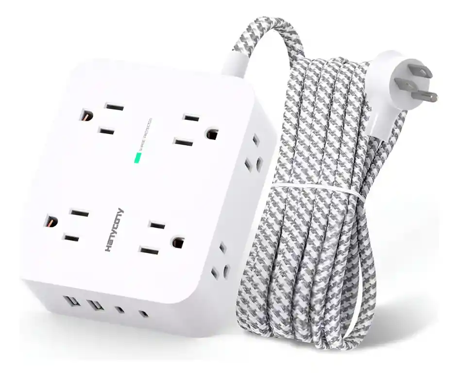 Marca: HANYCONY Color: Blanco Total de tomas de corriente: 8 Voltaje: 1.2E+2 Voltios Características especiales: 2 regletas de alimentación USB C, Interruptor de protección contra sobrecarga, 2.2 pulgadas de ancho espacio, Cable de extensión trenzado, Protección contra sobretensiones 1080 Regleta de alimentación 12 en 1 y 2.2 pulgadas de amplio espacio: protector de sobretensiones de diseño de 3 lados con 8 tomas de corriente alterna y 4 puertos de carga USB (2 USB C) que pueden alimentar hasta 12 dispositivos simultáneamente. Eso hace que sea más fácil hacer que los enchufes no cubran ninguna toma de corriente, y los 2.2 pulgadas ampliamente spped entre tomas, más grandes que el enchufe estándar, se ajustan a adaptadores grandes sin bloquearse entre sí. El diseño compacto ahorra más espacio, adecuado para el hogar, la oficina y los artículos esenciales del dormitorio universitario 2 tiras de alimentación USB C: 2 puertos USB C adicionales para tus dispositivos, el puerto USB C puede cargar hasta 5 V/3 A. Los puertos USB-A pueden cargar hasta 5 V/2.4 A máximo, todos los puertos USB de salida son de 5 V/3.1 A, 15.5 W máx. que es un 30% más rápido que otras estaciones de carga USB C. Con tecnología de carga inteligente, puede detectar automáticamente tus dispositivos y puede alcanzar una eficiencia de carga más rápida, se adapta perfectamente a tu iPhone, iPad, tableta, etc Protección contra sobretensiones de sobrecarga: la regleta de alimentación con protección contra sobrecarga protege tus aparatos eléctricos de iluminación, sobretensiones o picos. La capacidad mínima de absorción de energía de 1080 julios. Interruptor de encendido/apagado iluminado con disyuntor integrado para protección contra sobrecarga de todos los tomacorrientes. (La luz indicadora Protección contra sobretensiones se enciende para mostrar que tus dispositivos están protegidos) Cable de extensión para montaje en pared con enchufe plano: el enchufe plano de perfil bajo se adapta fácilmente en espacios reducidos y el diseño de enchufe plano en ángulo recto evita el bloqueo del enchufe inferior el cable de extensión trenzado mejorado de 5 pies (incluido el enchufe) es muy grueso y tiene una mejor capacidad de carga de corriente los dos agujeros de montaje en la parte posterior permiten que esta regleta se instale de forma segura en varias aplicaciones Protección de seguridad múltiple: certificados RoHS, ETL. Cortará automáticamente la energía para proteger los dispositivos conectados cuando la sobretensión sea abrumadora. Protección del medio ambiente y carcasa de policarbonato resistente al fuego con retardante de llama a 1382 GRADOS F lo que hace que sea más duradero y más largo de vida útil