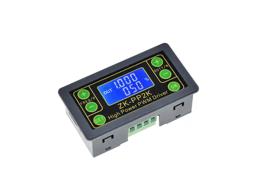 ZK-PP2K PWM DC Controlador de velocidad del motor Regulador de ciclo de trabajo de frecuencia Interruptor ajustable Atenuador LED Controlador de pulso digital 2 OOTDTY LED de accionamiento, motor, valor de solenoide y otras cargas directamente. Se puede utilizar para ajustar la frecuencia y el ciclo de trabajo, apto para regular el brillo del LED y la velocidad del motor. Se pueden elegir dos modos: PWM: frecuencia de regulación (continua) y ciclo de trabajo. El número de pulsos no se puede configurar en este modo, y el pulso es de ciclo encendido o apagado. PULSO: tiempo de ancho de pulso positivo, tiempo de ancho de pulso negativo, tiempo de inicio de retardo de encendido y número de pulsos son ajustables. Con el botón de inicio y parada, puede controlar la salida y parada de la señal. Ampliamente utilizado en la regulación de velocidad del motor de CC industrial, regulación de velocidad de la cinta transportadora industrial, iluminación y mediación de iluminación, enfriamiento de la fuente de alimentación de la computadora, ventiladores de CC, etc. Especificación: Modelo: ZK-PP2K Material: PVC y tablero de fibra de vidrio Tamaño: app.79 x 43 x 30 mm / 3.11 x 1.69 x 1.18in Voltaje de funcionamiento: 3.3-30V Rango de frecuencia: 1Hz-150KHz, la precisión es de aproximadamente 2%. El control de velocidad del motor generalmente elige 20 KHZ. Rango de ciclo de trabajo: 0-100%, 1% escalonado. Número de pulsos: 1-9999 o infinito (la pantalla '----' significa infinito). Tiempo de retardo de salida: 0.000s-9999s, el mínimo se puede configurar en 1ms. Longitud de ancho de pulso positivo y negativo: 0.000s-9999s, el mínimo se puede configurar en 1ms. Capacidad de carga de salida: menos de 8A (tubo interruptor MOS). Amplitud de salida: La amplitud es igual a la tensión de alimentación (OUT + está conectada directamente al módulo V +). Color: Como se muestra en la imagen Cantidad: 1 Pc Descripción del módulo: I Instrucciones de operación del botón: 1. Salida de tipo de interruptor de tubo MOS, sin forma de onda; 2. El número de tiempos abiertos alcanza el valor establecido, la salida se detiene automáticamente y "out" desaparece; 3. Presione el botón de encendido para controlar el inicio y el final de la salida. OUT desaparece para indicar que no hay salida, salida apagada; 4. Reinicio de encendido del botón ON para encender la salida, recalcular el número de veces abiertas; II modo PWM (la pantalla tiene "%" para el modo PWM) 1. El modo predeterminado de fábrica es el modo PWM, la frecuencia de ajuste de las teclas FREQ + y FREQ, el ciclo de trabajo establecido de los botones DUTY + y DUTY; presione brevemente la salida o parada de la señal de control del botón STOP , la salida de parada es 0, la pantalla muestra la marca "OUT" cuando hay salida; de lo contrario, detiene la salida; la frecuencia predeterminada de fábrica es de 1 KHZ y el ciclo de trabajo es del 50%. 2. Si desea cambiar al modo PULSE, mantenga presionado el botón SET (más de 6 segundos), no lo suelte, verá que la pantalla cambia, "%" desaparece, es el modo PULSE. III Modo PULSE (ningún "%" en el lado derecho de la pantalla es el modo PULSE) 1. La línea sobre la pantalla LCD muestra el tiempo de ancho de pulso positivo. Los botones P + y P- establecen el parámetro. La línea debajo de la pantalla LCD muestra el tiempo de ancho de pulso negativo. Los botones N + y N- establecen el parámetro. Presione el botón STOP para controlar la salida de señal o detener. Cuando se detiene la salida, la salida es 0. La pantalla muestra "OUT" para la salida; de lo contrario, detiene la salida; el ancho de pulso positivo predeterminado de fábrica es de 0,5 segundos y el ancho de pulso negativo es de 0,5 segundos. 2. Número de pulso y configuración del tiempo de retardo: en el modo PULSO, presione y mantenga presionado el botón SET durante 2 segundos y luego suelte, ingrese el número de pulso y la interfaz de configuración del tiempo de retardo, la pantalla muestra SET, se apagará y se borrará después de ingresar . ; Los botones P + y P- establecen el tiempo de retardo, N + y los botones N- establecen el número de pulsos, el tiempo de retardo predeterminado de fábrica es 0 segundos, el número de pulsos es infinito (pantalla ----); luego presione el botón SET 2 En segundos, volverá automáticamente a la interfaz de pulso, presione el botón STOP, después del tiempo de ajuste de retardo, comience a emitir el número establecido de pulsos. Si se envía el número de pulsos, automáticamente dará salida a 0. Si no se envía el período, al presionar el botón STOP se apagará. El pulso de salida se apaga y se borra, y el número de pulsos establecido se emite cada vez que se inicia. IV Ejemplos de funcionamiento de la aplicación 1. Salida PWM 20 KHZ, ciclo de trabajo del 60%: Seleccione el modo PWM, la frecuencia se establece en 20,00 y la relación de trabajo se establece en 060%. 2. La salida se enciende durante 0,6 segundos y se apaga durante 0,2 segundos. Bucle infinito: seleccione el modo PULSE, el ancho de pulso positivo se establece en 0,600, el ancho de pulso negativo se establece en 0,200, el tiempo de retardo se establece en 0,000 y el número de pulsos se establece en --- -. 3. Encienda o presione el botón de inicio, demore 5 segundos, luego la salida se enciende durante 0.6 segundos, se apaga 0.2 segundos, bucle infinito: seleccione el modo PULSE , el ancho de pulso positivo se establece en 0.600, el ancho de pulso negativo se establece en 0.200 , retraso El tiempo se establece en 5.000 y el número de pulsos se establece en - -. 4. Encienda o presione el botón de inicio, demore 5 segundos, luego emita nivel alto 10 ms bajo nivel 10 ms pulso 100: seleccione el modo PULSO, pulso positivo el ancho se establece en 0.010, el ancho de pulso negativo se establece en 0.010, el retardo El tiempo se establece en 5.000 y el número de pulsos se establece en 0100. 5. Retardo de encendido dura