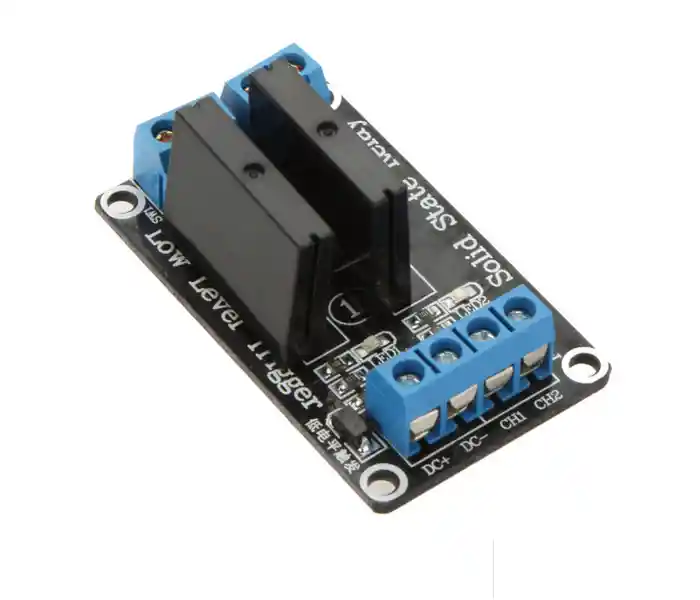Reles de estado solido de 5V 240V 2A, salida con fusible resistivo 240V 2A. Tamaño: 55 * 33 * 25 (L * W * H) Peso: 21.5g Fuente de alimentacion de entrada: 5V DC (160MA) Voltaje de la señal de control de entrada: (0-2.5V reles de estado bajo en ON) (Rele alto de estado 3.3-5V apagado) Terminales azules KF301 a la linea de control es mas conveniente. Interfaz del modulo: Seccion de entrada: DC +: fuente de alimentacion positiva (segun el suministro de tension del rele) DC-: negativo CH1: 1 final de activacion de señal del modulo de rele (bajo para activar activa) CH2: final de activacion de señal del modulo de 2 reles (bajo para activar activa). Parametros electricos: Version de voltaje corriente de reposo corriente de trabajo voltaje de disparo corriente de disparo 1 canal 5V 0mA 12.5mA 0-2.5V 2mA 2 vias 5V 0mA 22.5mA 0-2.5V 2mA LA COMPRA INCLUYE: 1X RELE ESTADO SOLIDO 2 CANALES LOW LEVEL TRIGGER