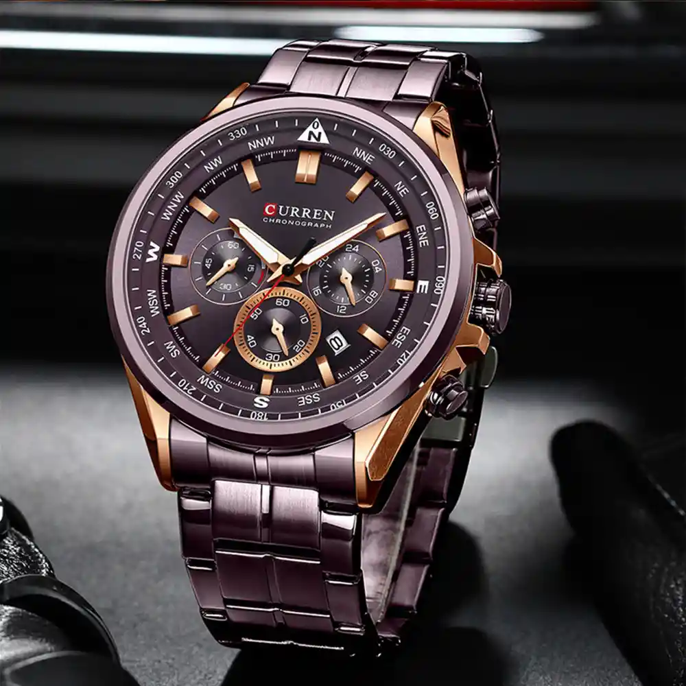 Reloj para Hombre Marca: Curren Modelo: 8399 Estilo: A la moda y casual Material del pulso: Acero inoxidable Material de la caja: Acero inoxidable Tipo de cierre: Con pulsera Diámetro de la caja: 52 mm Diámetro del dial: 41 mm Ancho del pulso: 23 mm Grosor de la caja: 13 mm Longitud del pulso: 19 cm Peso del reloj: 164 g Material del vidrio: Hardlex Movimiento: Cuarzo Visualización: Analógico Característica: Manecillas luminosas, calendario y Cronógrafos funcionales (segundero, minutero y 24 horas). Adecuado para el uso diario, resistente a salpicaduras y lluvia. No es adecuado para ducharse, bañarse, nadar, practicar snorkel, trabajos relacionados con el agua caliente agua salada y pescar.