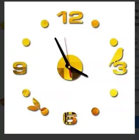 Descripción "Bienvenidos a GENUINOS SHOP Tecnología Del Futuro" ¡Somos expertos en los mejores artículos de tecnología, belleza y hogar con amplia trayectoria y calidad garantizada! Entregas inmediatas en la ciudad de Bogotá y envíos a Nivel Nacional. RELOJ DE PARED 3D GRANDE PARA DECORACIÓN DE INTERIORES Elegante diseño con materiales de alta calidad para exaltar tu lugar favorito. Facil de instalar, colores a elección. CARACTERISTICAS Material: acrílico Tamaño: Ajustable a elección del usuario, se recomienda entre 70 y 120 Cm Tamaño de las manecillas: 33.4 Cm Hora y 27 Cm Minutero Energía: Requiere una pila AA (no incluida) Modo de uso: 1. Fije el gancho en la pared 2. Cuelgue el dial en el gancho 3. Marque el radio que desee (70-120 cm ) 4. Retire la película protectora 5. Mantenga el puntero equilibrado y pegue las letras y números 6. Finalización del reloj de pared con autoadhesivo (no es necesario romper ni taladrar) TE ENTREGAMOS: 1-Reloj de pared armable con sus accesorios (observar imagen) IMPORTANTE Para poder tener una buena experiencia en tu compra, te recomendamos que leas detalladamente las siguientes recomendaciones: • Lee completamente la descripción del producto. • Revisa muy bien que sea el producto que necesitas para evitar devoluciones. Garantía del vendedor: 30 días
