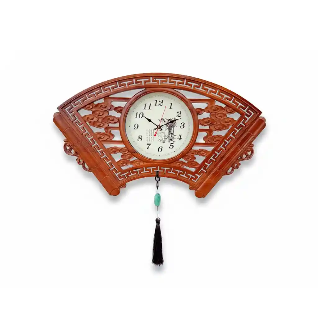 Exclusivo reloj de pared con forma de abanico tradicional, ideal para aportar un toque cultural y artístico a tu hogar. Fabricado en madera con acabados detallados que resaltan la veta natural y proporcionan una estructura robusta y elegante. Cuenta con calados intrincados que representan nubes y patrones geométricos, demostrando una alta calidad en su fabricación. Dial central de color claro con números arábigos grandes y manecillas negras que facilitan la lectura de la hora a distancia. Incluye un adorno colgante con una piedra decorativa y una borla negra que añade movimiento y distinción a la pieza. El fondo del reloj presenta un delicado dibujo de bambú y caligrafía, reforzando su estética de inspiración asiática. Por su gran tamaño y diseño único, es la pieza perfecta para decorar salas, estudios o pasillos con un estilo sofisticado. Equipado con un sistema de cuarzo confiable que asegura la exactitud del tiempo con un mantenimiento mínimo. Estructura diseñada para una instalación sencilla y segura en cualquier pared, transformando el ambiente de inmediato. Su tono madera caoba combina armoniosamente con mobiliario clásico, rústico o decoraciones de madera natural. Materiales seleccionados para resistir el paso del tiempo manteniendo su belleza y funcionalidad decorativa intactas. Su superficie permite remover el polvo de forma sencilla con un paño seco, manteniendo su brillo original por más tiempo. Estos productos han sido ambientados, los accesorios adicionales no están incluidos y su color puede variar por la luz.