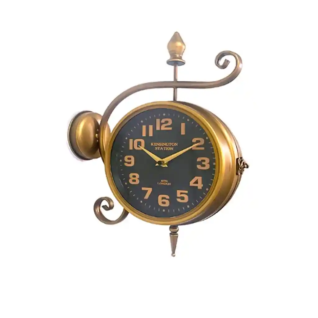 Reloj de pared inspirado en las antiguas estaciones de tren de Londres, aportando un aire retro y sofisticado a cualquier ambiente. Cuenta con dos esferas operativas, lo que permite visualizar la hora desde ambos lados, ideal para pasillos o divisiones de ambientes. Fabricado con una estructura metálica en tono bronce/latón que resalta su estética "vintage" y garantiza durabilidad. Incluye un brazo de soporte curvo con detalles en espiral y un remate superior tipo lanza para una instalación fija en la pared. Fondo oscuro con números arábigos y manecillas en tono dorado/crema de gran tamaño, facilitando una lectura clara de la hora. La cara del reloj incluye la inscripción "Kensington Station" y "1870 London", reforzando su carácter decorativo tradiciona. El cuerpo del reloj dispone de un pestillo lateral metálico que permite abrir la estructura para ajustar la hora o cambiar las baterías fácilmente. Su diseño atemporal complementa decoraciones industriales, rústicas, clásicas o coloniales en hogares y oficinas. La base circular del soporte cuenta con orificios para un montaje seguro y firme en muros o columnas. Se entrega en un empaque protegido para asegurar que la pieza llegue en perfectas condiciones hasta la puerta de tu hogar.. Estos productos han sido ambientados, los accesorios adicionales no están incluidos y su color puede variar por la luz.. . . .