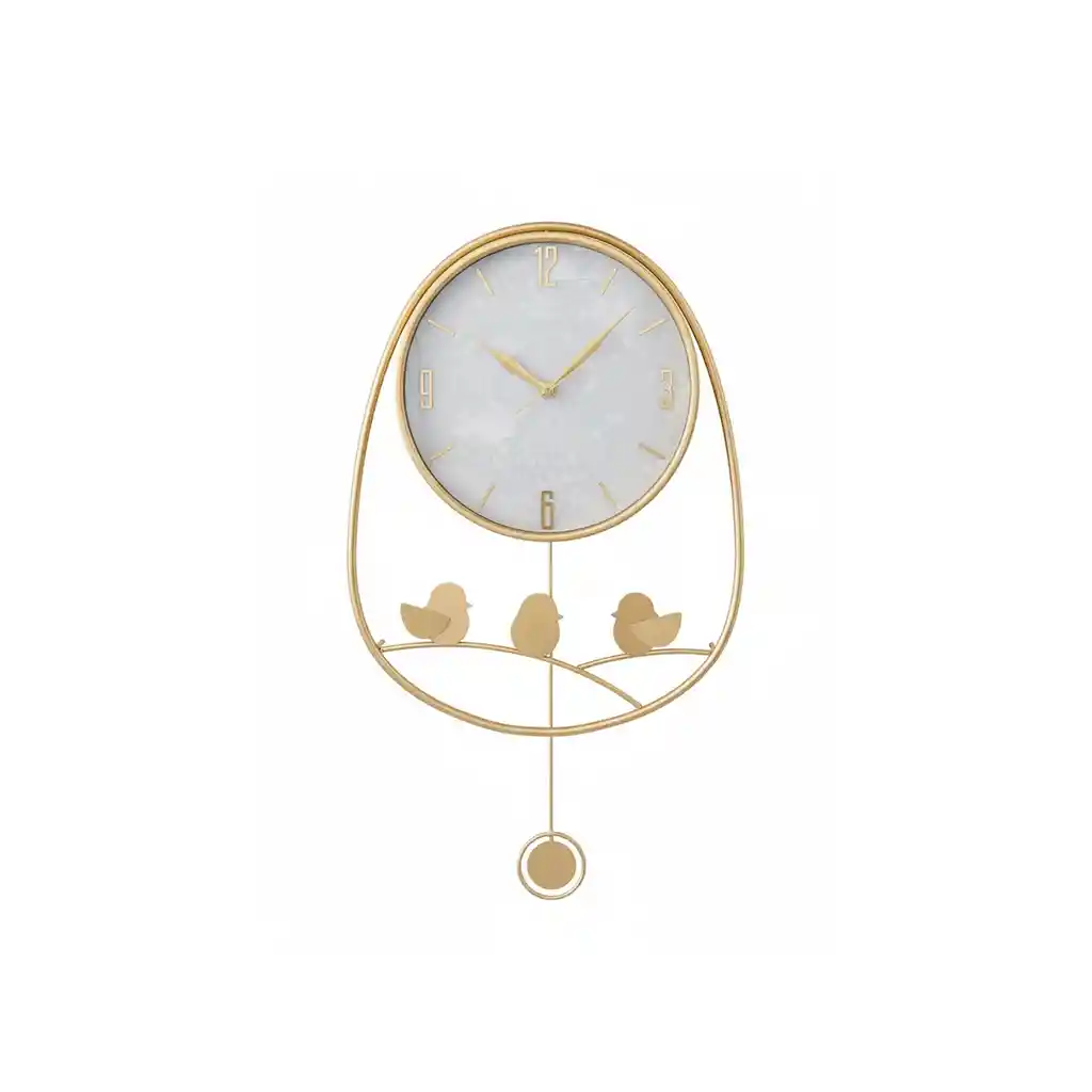 Elegante estructura ovalada en color dorado que presenta una escena minimalista de tres pájaros posados sobre una rama. Incluye un péndulo circular dorado que cuelga de la base, añadiendo movimiento y un toque clásico renovado a la pieza. Estructura metálica con un recubrimiento dorado de alta calidad que aporta brillo y sofisticación a cualquier ambiente. El fondo del reloj presenta un acabado marmoleado en tonos grises y blancos, creando un contraste moderno con las manecillas doradas. Marcadores de hora estilizados y números grandes en las posiciones 12, 3, 6 y 9 para una lectura clara y estética. Su silueta abierta y ligera lo hace perfecto para decoraciones de interiores tipo nórdico, moderno o "glam". Maquinaria de precisión que garantiza un movimiento fluido de las manecillas sin ruidos molestos. Estructura liviana diseñada para instalarse de forma segura en cualquier pared de la sala, alcoba u oficina. Actúa como una pieza de arte decorativo que llena de vida muros vacíos gracias a su diseño tridimensiona. Se entrega en un empaque protegido para asegurar que la pieza llegue en perfectas condiciones hasta la puerta de tu hogar.. Estos productos han sido ambientados, los accesorios adicionales no están incluidos y su color puede variar por la luz.. . . .