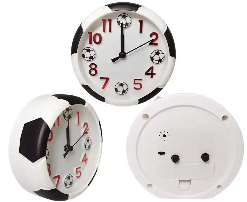 Somos Inversiones MAZUGI RELOJ DESPERTADOR DE MESA Hecho de plástico Diseño balón de futbol Medidas Alto: 11cm Largo: 11cm Ancho: 4cm Presentación en caja