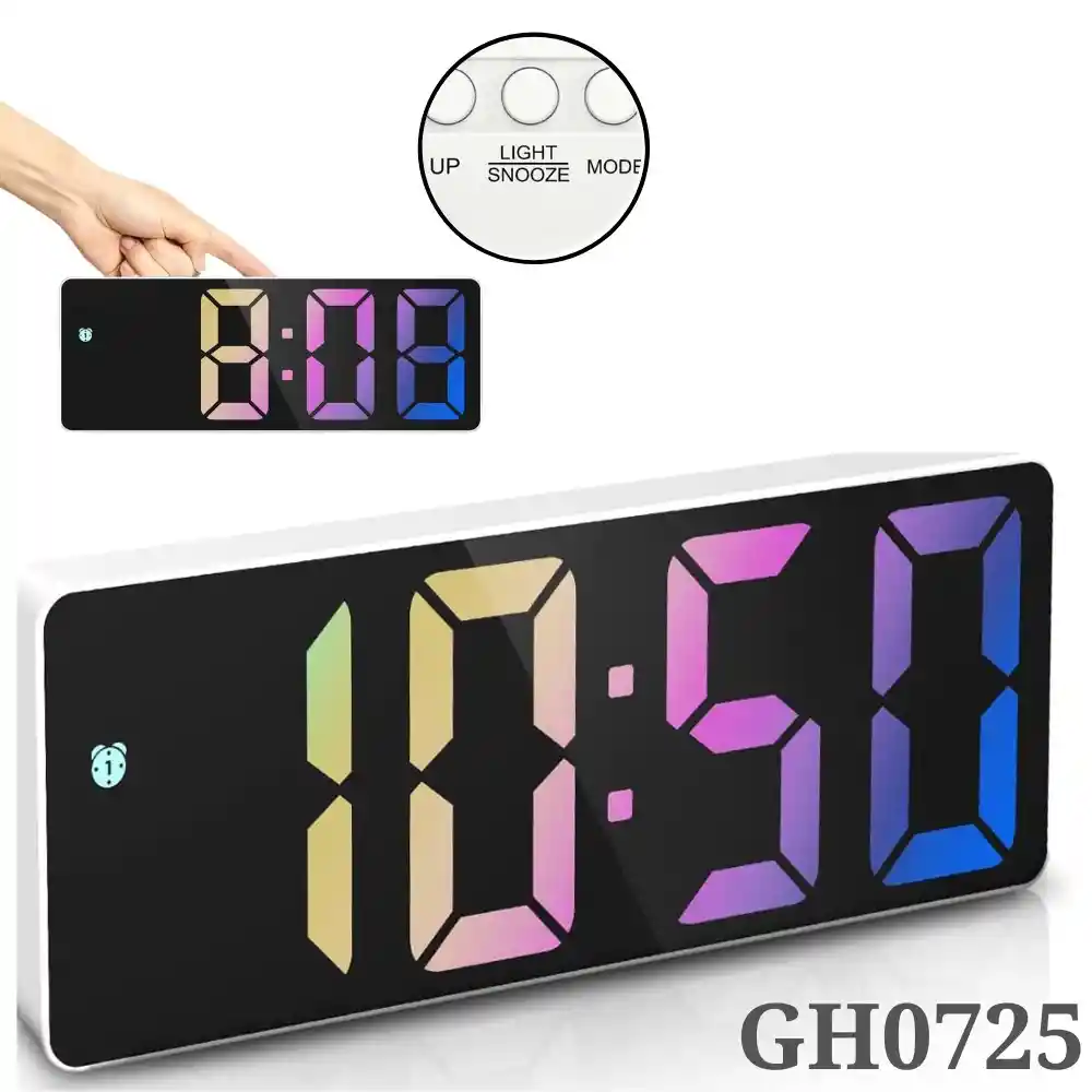 Color de luz: Multicolor (Como muestra en la imagen de referencia) Características funcionales: - 4 modos de visualización: este despertador digital cuenta con pantalla de dígitos grandes en la cual muestra reloj, fecha y temperatura - El formato de 12/24 horas se puede cambiar a voluntad, lo que le permite comprender fácilmente la hora, satisfaciendo sus necesidades diarias. - 3 niveles de brillo: el despertador digital proporciona 3 niveles diferentes de brillo, que se pueden ajustar a un brillo cómodo manualmente para proteger tus ojos y ahorrar energía por la noche. - 2 formas de fuente de alimentación: admite fuente de alimentación USB y fuente de pilas AAA (NO INCLUIDAS) NOTA: -Este reloj despertador tiene una función de memoria de tiempo y configuración cuando se utiliza con fuente de alimentación AAA; cuando se alimenta solo por fuente USB, NO HAY función de memoria después del apagado. -La pantalla no siempre estará encendida cuando se trabaja con la fuente de alimentación AAA en lugar de la alimentación USB. - Pantalla colorida de dígitos: La fuente de color utilizada en este reloj despertador digital es una actualización e iteración de la fuente monocromática del reloj despertador digital ordinario, lo que hace que el reloj despertador sea una decoración en su escritorio, deslumbrante. El paquete incluye: 1 * Reloj despertador digital 1 * enchufe de alimentación USB 1 * Manual de usuario