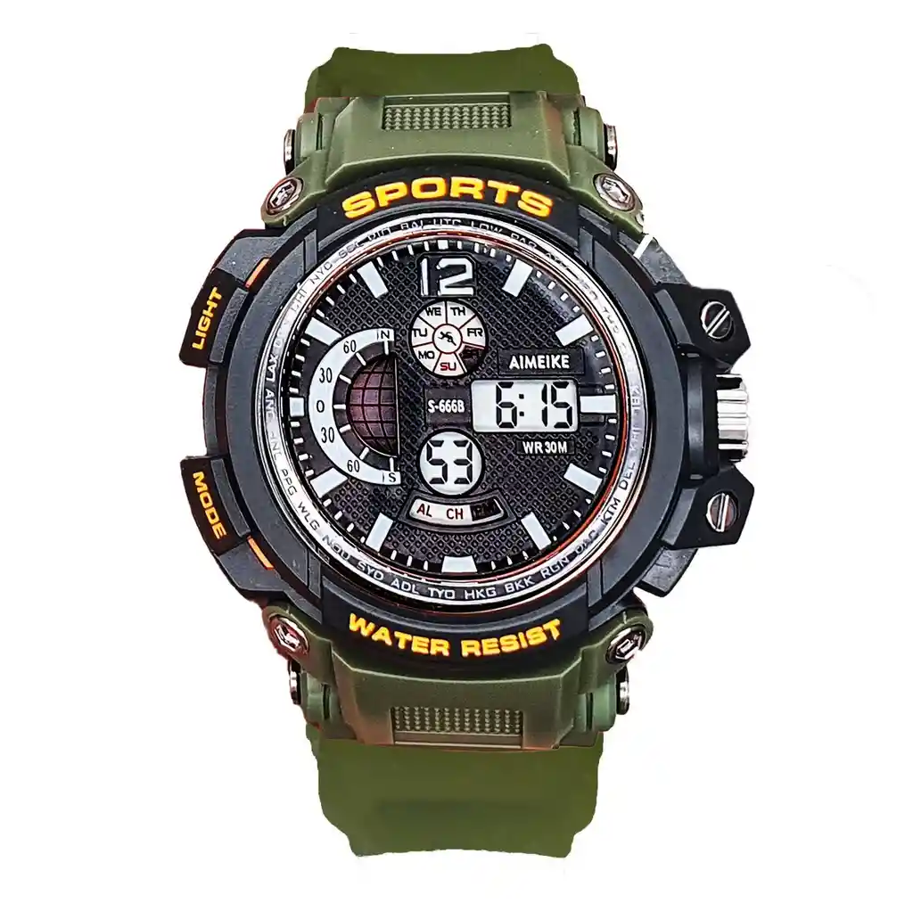 La marca de relojes deportivos Aimeike digitales resistentes al agua es una línea de relojes diseñada para personas activas y deportistas que necesitan un reloj duradero y confiable. Estos relojes están diseñados para soportar las condiciones más difíciles y extremas, incluyendo el agua y las actividades acuáticas. Además de ser resistentes al agua, estos relojes también son resistentes a los golpes y al desgaste, lo que los convierte en la opción ideal para actividades al aire libre y deportes extremos. Su diseño deportivo y moderno los hace también un accesorio perfecto para cualquier atuendo casual. // Nota: se envía el reloj su respectivo estuche // Ficha Técnica: Diámetro reloj caballero: 4.6 cm Longitud correa reloj caballero: 24 cm Grosor esfera: 1.5 cm Ideal para adultos y adolescentes Materiales: Poliuretano y silicona Funciones: Luz Led 7 colores, Cronometro, Alarma, Calendario y resistencia al agua. Términos de garantía: _Para defectos de fábrica o retractos: _Por favor revise el producto apenas lo reciba y antes de usarlo. No aplican ley de retracto o defectos de fábrica luego de usar el producto. Se manejan máximo 5 días para reportar defectos de fábrica (por ejemplo, piezas faltantes, rotas, etc). En cuanto a maquinaria se da tres meses de garantía, es decir el buen funcionamiento del producto. Para hacer efectiva la devolución el producto debe devolverse con el empaque original, el cual debe estar en buen estado, incluir todos los documentos y las partes completas y sin daños. Los cuidados y recomendaciones para mantener un producto en buen estado son los siguientes: No aplicarle perfumes ni cremas directamente, no mojarlos, no dejarlos caer y procurar limpiarlos para retirar suciedad.