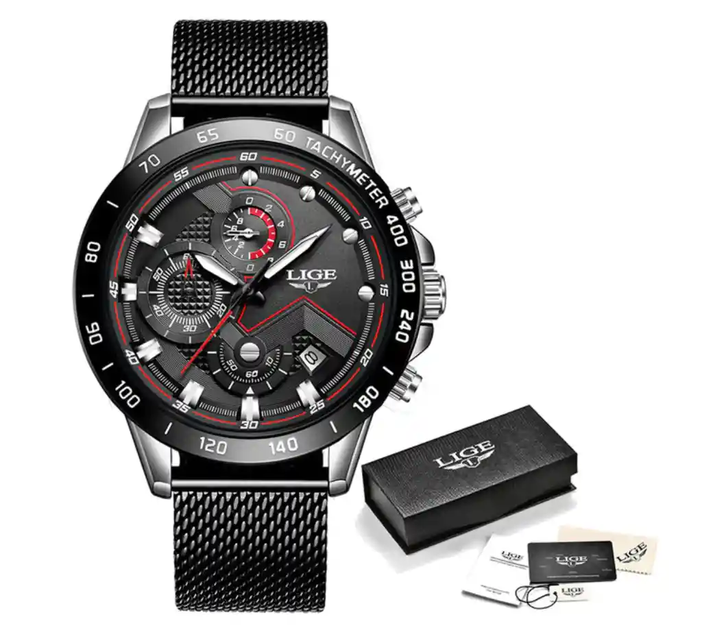 La calidad es la primera con el mejor servicio. Todos los clientes son nuestros amigos. Diseño de moda de alta calidad. CARACTERISTICAS Dial de diseño de alta calidad de lujo de marca superior Marca: Lige Pantalla: reloj de cuarzo analógico Estilo: moda, informal, negocios, lujo, deporte Otras Características: resistente al agua, fecha automática, cronógrafo, resistente a los golpes, función de visualización de fecha Movimiento: movimiento de cuarzo japonés Original Resistente al agua a 3ATM / 30M (admite ducha fría, no utilizar el reloj bajo el agua, no soporta agua caliente); -Correa de acero inoxidable de calidad; Crisol de grafito mini horno de oro de la antorcha de fusión del metal: Incluye: Caja original Reloj Nuevo Paño Tarjeta de Originalidad Manual