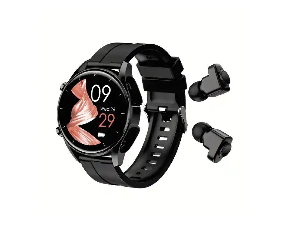 Reloj Inteligente + Audífonos Wattana WT-SMB-01 Smarbeta Smart Watch Reloj inteligente para 2 en 1 Audífonos inalámbricos estéreo combinados Bluetooth Teléfono de llamadas para Android IOS, su diseño de pantalla redonda de 1,28 pulgadas 240 x240 te brinda un amplio campo de visibilidad, cuenta con certificación IP67 que lo hace resistente a entornos de polvo y agua. Características: frecuencia cardíaca, presión arterial, oxígeno en sangre, pasos, calorías, kilometraje de ejercicio, tomar fotografías, monitoreo del sueño, despertador, registro de mensajes, recordatorio de sedentarismo, recordatorio de llamadas.