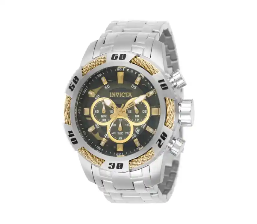Caja y brazalete de acero inoxidable, diseño deportivo tipo cronógrafo, movimiento de cuarzo preciso y cristal resistente. Detalles modernos en la esfera, marcadores luminosos y buena resistencia al agua para uso diario.