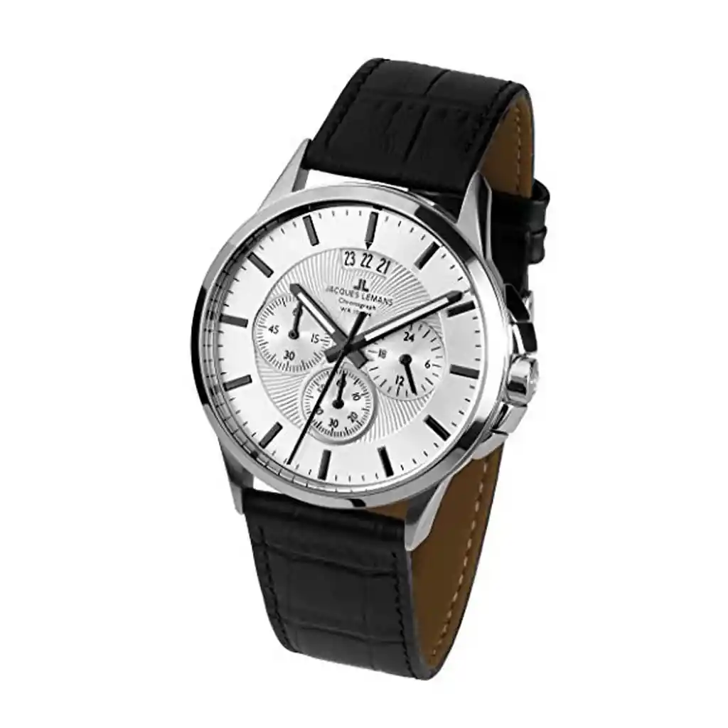 Jacques Lemans Disfrutar es el arte de vivir. Los relojes de Jacques Lemans hacen que te des cuenta de momentos únicos. Suscitan emociones y evocan una sonrisa con cada mirada en la muñeca. Género: Hombre Función: Cronógrafo Tamaño De La Caja: 42mm Material Caja: Acero Inoxidable Sólido Material Cristal: Cristal Cristex Endurecido Material Correa/Pulsera: Correa De Cuero Color Del Pulso: Negro Color Tablero: Plata Resistencia al agua: 10 ATM