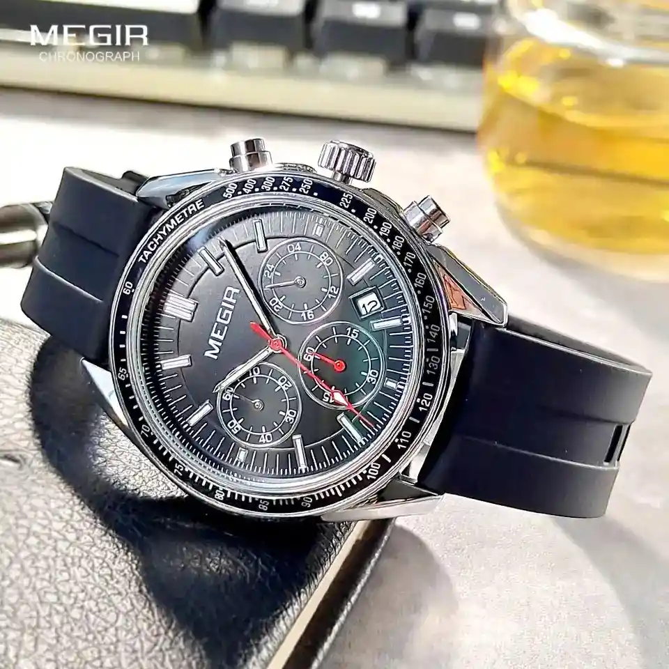 -Tipo de hora: Analoga -Calendario funcional: Si -Material del dial: Acero inoxidable -Material de la correa: Silicona -Resistente al agua: 3 ATM -Manecillas luminosa -peso del reloj: 58g -Ancho de banda: Aproximadamente 20mm -Longitud de la banda: Aproximadamente 250mm