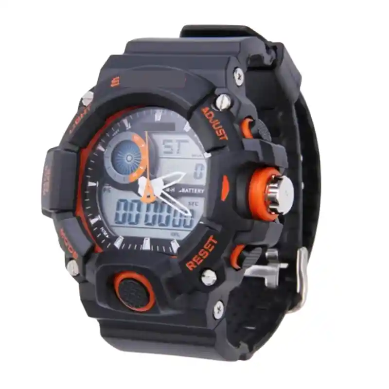 Destacado Resistente al agua (No para buceo o natación) Resistente a los golpes Magnífico y sorprendente diseño Doble movimiento Dos tipos de visualización de tiempo Viene con pantalla de luz de fondo con fecha y hora Especificaciones Reloj analógico-digital para hombre Con visualización de tiempo y semana Características retroiluminación y cronómetro El movimiento de cuarzo promete precisión Cierre de hebilla simple sujetada Celda de botón incluida Regalo ideal para amigos Cierre: Hebilla Género masculino Material de la banda: Caucho