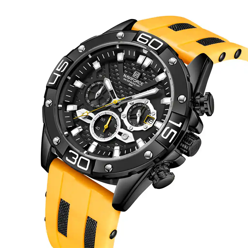 Descubre la elegancia y sofisticación de los relojes **Naviforce**, diseñados para quienes buscan estilo, calidad y funcionalidad en un solo accesorio. Con materiales de primera y un diseño innovador, este reloj no solo complementa tu look, sino que también resalta tu personalidad con un toque de lujo y distinción. Su correa elegante se adapta perfectamente a cualquier ocasión, permitiéndote lucir impecable en todo momento. Más que un simple reloj, **Naviforce** es sinónimo de prestigio y modernidad, ideal para quienes desean destacar con cada detalle. ¡Hazlo tuyo y eleva tu estilo al siguiente nivel! /// El reloj incluye su estuche original y tarjeta de garantía. /// Ficha Técnica Pantalla Análoga Resistencia al agua de 3ATM (solo exposición accidental al agua No ducha, No se puede sumergir, No usar en actividades acuáticas). Tipo de cierre: Hebilla Material de la caja: Aleación de Zinc Metal Grosor de esfera: 1.4 cm Ancho correa: 2.4 cm Diámetro: 4.6 cm Material de la correa banda: Goma Longitud de La correa: 26 cm ( Ajustable ) Peso neto: 101g Términos de garantía: Para defectos de fábrica o solicitudes de retracto, es importante revisar el producto inmediatamente al recibirlo y antes de usarlo, ya que no aplicará garantía una vez utilizado. Se dispone de un máximo de 5 días para reportar defectos de fábrica, como piezas faltantes o rotas. En el caso de maquinaria, la garantía cubre tres meses para garantizar su correcto funcionamiento. Para efectuar una devolución, el producto debe ser devuelto en su empaque original, en buen estado, con todos los documentos y partes completas y sin daños.