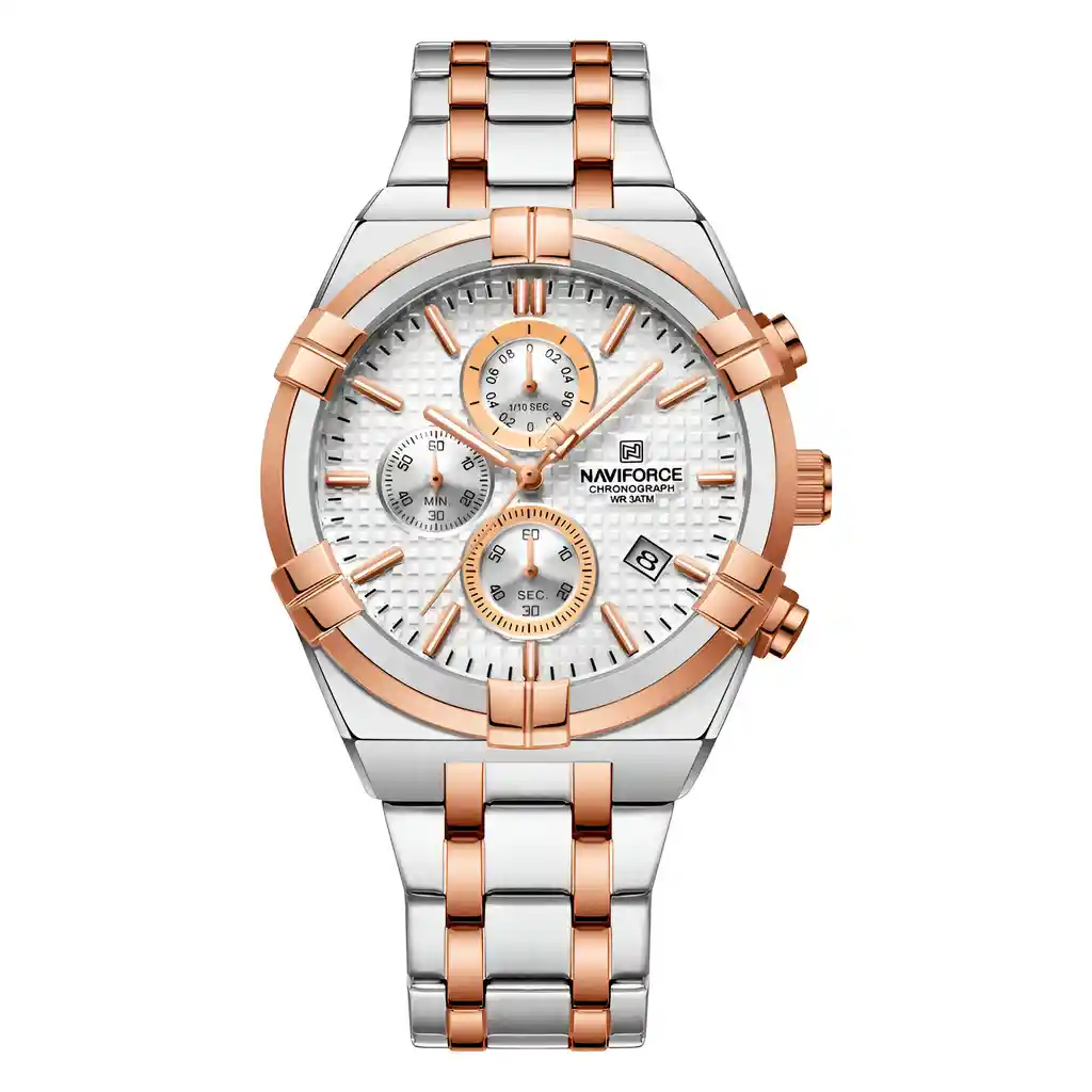 Descubre la elegancia y sofisticación de los relojes **Naviforce**, diseñados para quienes buscan estilo, calidad y funcionalidad en un solo accesorio. Con materiales de primera y un diseño innovador, este reloj no solo complementa tu look, sino que también resalta tu personalidad con un toque de lujo y distinción. Su correa elegante se adapta perfectamente a cualquier ocasión, permitiéndote lucir impecable en todo momento. Más que un simple reloj, **Naviforce** es sinónimo de prestigio y modernidad, ideal para quienes desean destacar con cada detalle. ¡Hazlo tuyo y eleva tu estilo al siguiente nivel! /// El reloj incluye su estuche original y tarjeta de garantía. /// Ficha Técnica Pantalla Análoga Resistencia al agua de 3ATM (solo exposición accidental al agua No ducha, No se puede sumergir, No usar en actividades acuáticas). Tipo de cierre: Hebilla Material de la caja: Aleación de Zinc Metal Grosor de esfera: 1.2 cm Ancho correa: 2 cm Diámetro: 4.3 cm Material de la correa banda: Acero Inoxidable Longitud de La correa: 24 cm ( Se puede recortar ) Peso neto: 135g Términos de garantía: Para defectos de fábrica o solicitudes de retracto, es importante revisar el producto inmediatamente al recibirlo y antes de usarlo, ya que no aplicará garantía una vez utilizado. Se dispone de un máximo de 5 días para reportar defectos de fábrica, como piezas faltantes o rotas. En el caso de maquinaria, la garantía cubre tres meses para garantizar su correcto funcionamiento. Para efectuar una devolución, el producto debe ser devuelto en su empaque original, en buen estado, con todos los documentos y partes completas y sin daños.
