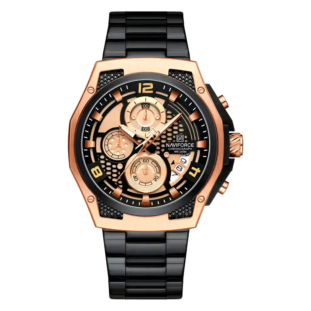 Descubre la elegancia y sofisticación de los relojes **Naviforce**, diseñados para quienes buscan estilo, calidad y funcionalidad en un solo accesorio. Con materiales de primera y un diseño innovador, este reloj no solo complementa tu look, sino que también resalta tu personalidad con un toque de lujo y distinción. Su correa elegante se adapta perfectamente a cualquier ocasión, permitiéndote lucir impecable en todo momento. Más que un simple reloj, **Naviforce** es sinónimo de prestigio y modernidad, ideal para quienes desean destacar con cada detalle. ¡Hazlo tuyo y eleva tu estilo al siguiente nivel! /// El reloj incluye su estuche original y tarjeta de garantía. /// Ficha Técnica Pantalla Análoga Resistencia al agua de 3ATM (solo exposición accidental al agua No ducha, No se puede sumergir, No usar en actividades acuáticas). Tipo de cierre: Hebilla Material de la caja: Aleación de Zinc Metal Grosor de esfera: 1.3 cm Ancho correa: 2.2 cm Diámetro: 4.4 cm Material de la correa banda: Acero Inoxidable Longitud de La correa: 25 cm ( Se puede recortar ) Peso neto: 163g Términos de garantía: Para defectos de fábrica o solicitudes de retracto, es importante revisar el producto inmediatamente al recibirlo y antes de usarlo, ya que no aplicará garantía una vez utilizado. Se dispone de un máximo de 5 días para reportar defectos de fábrica, como piezas faltantes o rotas. En el caso de maquinaria, la garantía cubre tres meses para garantizar su correcto funcionamiento. Para efectuar una devolución, el producto debe ser devuelto en su empaque original, en buen estado, con todos los documentos y partes completas y sin daños.