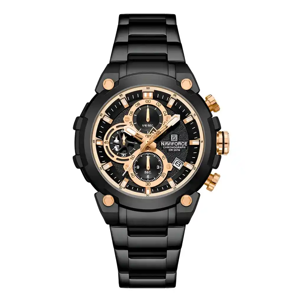Descubre la elegancia y sofisticación de los relojes **Naviforce**, diseñados para quienes buscan estilo, calidad y funcionalidad en un solo accesorio. Con materiales de primera y un diseño innovador, este reloj no solo complementa tu look, sino que también resalta tu personalidad con un toque de lujo y distinción. Su correa elegante se adapta perfectamente a cualquier ocasión, permitiéndote lucir impecable en todo momento. Más que un simple reloj, **Naviforce** es sinónimo de prestigio y modernidad, ideal para quienes desean destacar con cada detalle. ¡Hazlo tuyo y eleva tu estilo al siguiente nivel! /// El reloj incluye su estuche original y tarjeta de garantía. /// Ficha Técnica Pantalla Análoga Resistencia al agua de 3ATM (solo exposición accidental al agua No ducha, No se puede sumergir, No usar en actividades acuáticas). Tipo de cierre: Hebilla Material de la caja: Aleación de Zinc Metal Grosor de esfera: 1.4 cm Ancho correa: 2 cm Diámetro: 4.55 cm Material de la correa banda: Acero Inoxidable Longitud de La correa: 24 cm ( Se puede recortar ) Peso neto: 152g Términos de garantía: Para defectos de fábrica o solicitudes de retracto, es importante revisar el producto inmediatamente al recibirlo y antes de usarlo, ya que no aplicará garantía una vez utilizado. Se dispone de un máximo de 5 días para reportar defectos de fábrica, como piezas faltantes o rotas. En el caso de maquinaria, la garantía cubre tres meses para garantizar su correcto funcionamiento. Para efectuar una devolución, el producto debe ser devuelto en su empaque original, en buen estado, con todos los documentos y partes completas y sin daños.
