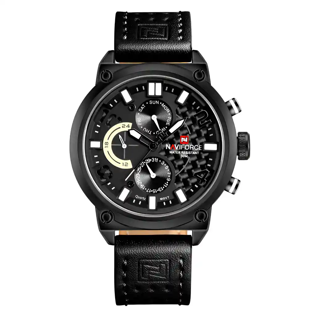 Descubre la elegancia y sofisticación de los relojes **Naviforce**, diseñados para quienes buscan estilo, calidad y funcionalidad en un solo accesorio. Con materiales de primera y un diseño innovador, este reloj no solo complementa tu look, sino que también resalta tu personalidad con un toque de lujo y distinción. Su correa elegante se adapta perfectamente a cualquier ocasión, permitiéndote lucir impecable en todo momento. Más que un simple reloj, **Naviforce** es sinónimo de prestigio y modernidad, ideal para quienes desean destacar con cada detalle. ¡Hazlo tuyo y eleva tu estilo al siguiente nivel! /// El reloj incluye su estuche original y tarjeta de garantía. /// Ficha Técnica Pantalla Análoga Resistencia al agua de 3ATM (solo exposición accidental al agua No ducha, No se puede sumergir, No usar en actividades acuáticas). Tipo de cierre: Hebilla Material de la caja: Aleación de Zinc Metal Grosor de esfera: 1.2 cm Ancho correa: 2.2 cm Diámetro: 4.8 cm Material de la correa banda: Cuero Longitud de La correa: 26 cm ( Ajustable ) Peso neto: 95.5g Términos de garantía: Para defectos de fábrica o solicitudes de retracto, es importante revisar el producto inmediatamente al recibirlo y antes de usarlo, ya que no aplicará garantía una vez utilizado. Se dispone de un máximo de 5 días para reportar defectos de fábrica, como piezas faltantes o rotas. En el caso de maquinaria, la garantía cubre tres meses para garantizar su correcto funcionamiento. Para efectuar una devolución, el producto debe ser devuelto en su empaque original, en buen estado, con todos los documentos y partes completas y sin daños.