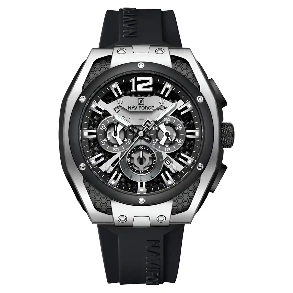 Descubre la elegancia y sofisticación de los relojes **Naviforce**, diseñados para quienes buscan estilo, calidad y funcionalidad en un solo accesorio. Con materiales de primera y un diseño innovador, este reloj no solo complementa tu look, sino que también resalta tu personalidad con un toque de lujo y distinción. Su correa elegante se adapta perfectamente a cualquier ocasión, permitiéndote lucir impecable en todo momento. Más que un simple reloj, **Naviforce** es sinónimo de prestigio y modernidad, ideal para quienes desean destacar con cada detalle. ¡Hazlo tuyo y eleva tu estilo al siguiente nivel! /// El reloj incluye su estuche original y tarjeta de garantía. /// Ficha Técnica Pantalla Análoga Resistencia al agua de 3ATM (solo exposición accidental al agua No ducha, No se puede sumergir, No usar en actividades acuáticas). Tipo de cierre: Hebilla Material de la caja: Aleación de Zinc Metal Grosor de esfera: 1.4 cm Ancho correa: 2 cm Diámetro: 4.6 cm Material de la correa banda: Goma Longitud de La correa: 26 cm Ajustable Peso neto: 110g Términos de garantía: Para defectos de fábrica o solicitudes de retracto, es importante revisar el producto inmediatamente al recibirlo y antes de usarlo, ya que no aplicará garantía una vez utilizado. Se dispone de un máximo de 5 días para reportar defectos de fábrica, como piezas faltantes o rotas. En el caso de maquinaria, la garantía cubre tres meses para garantizar su correcto funcionamiento. Para efectuar una devolución, el producto debe ser devuelto en su empaque original, en buen estado, con todos los documentos y partes completas y sin daños.