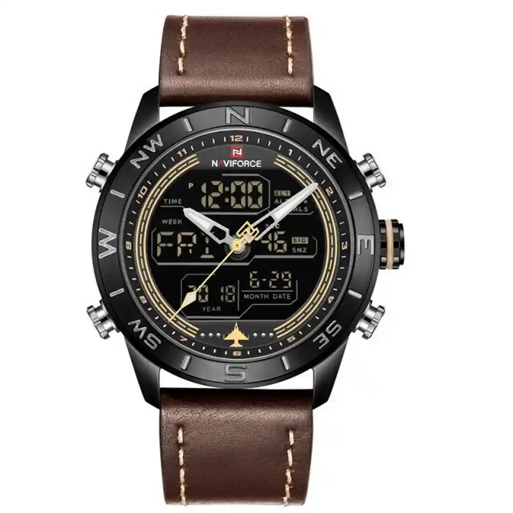 Los mejores relojes te los trae la marca Naviforce con sus sorprendentes estilos que definitivamente te enamoraran. Todos sus diseños son inspirados en la comodidad y satisfacción del cliente, ofreciéndote relojes con materiales de la más alta calidad, estilos innovadores y de cualidades inigualables. El reloj Naviforce es un accesorio indispensable que cumplirá con todas las expectativas que buscas en un reloj, uniendo lo mejor de la moda y destacando tu belleza a la hora de portarlo, con su correa en cuero elegante de lujo te brinda un toque refinado para lucir y combinar muy bien con todos tus looks diarios. // El reloj incluye su estuche original y tarjeta de garantía. /// Ficha Técnica: Muestra día, fecha, hora, Luz de Fondo, Alarma Doble núcleo con pantalla digital y analógica Resistencia al agua de 3ATM (solo exposición accidental al agua No ducha, No se puede sumergir, No usar en actividades acuáticas). Material de la caja: Metal Ancho correa: 2.4 cm Diámetro: 4.5 cm Grosor de la caja Espesor del estuche: 1.5 cm Material de la correa banda: Cuero Longitud de La correa: 26 cm Peso neto: 92 g Términos de garantía: _Para defectos de fábrica o retractos: _Por favor revise el producto apenas lo reciba y antes de usarlo. No aplican ley de retracto o defectos de fábrica luego de usar el producto. Se manejan máximo 5 días para reportar defectos de fábrica (por ejemplo, piezas faltantes, rotas, etc). En cuanto a maquinaria se da tres meses de garantía, es decir el buen funcionamiento del producto. Para hacer efectiva la devolución el producto debe devolverse con el empaque original, el cual debe estar en buen estado, incluir todos los documentos y las partes completas y sin daños. Los cuidados y recomendaciones para mantener un producto en buen estado son los siguientes: No aplicarle perfumes ni cremas directamente, no mojarlos, no dejarlos caer y procurar limpiarlos para retirar suciedad.