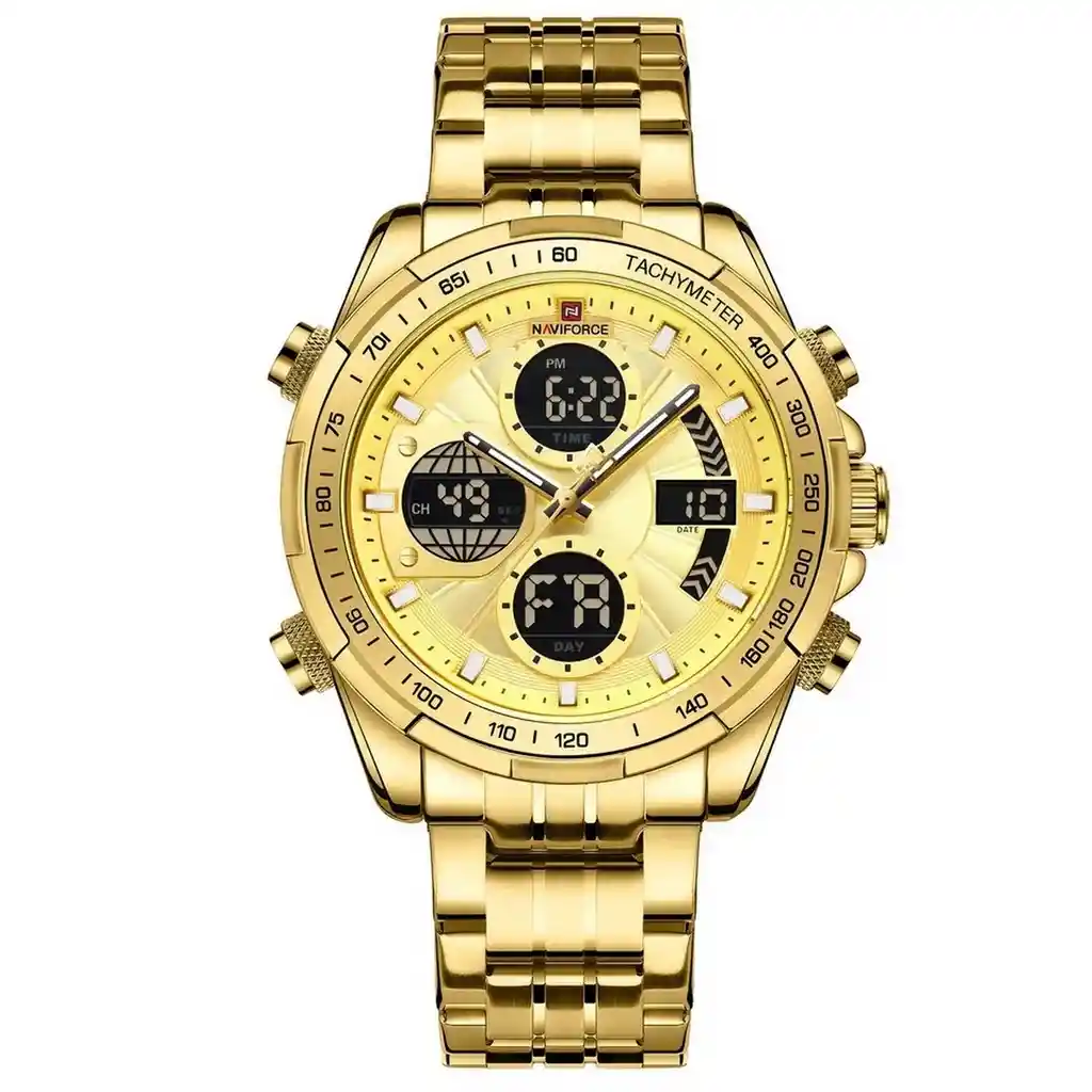 Los mejores relojes te los trae la marca Naviforce con sus sorprendentes estilos que definitivamente te enamoraran. Todos sus diseños son inspirados en la comodidad y satisfacción del cliente, ofreciéndote relojes con materiales de la más alta calidad, estilos innovadores y de cualidades inigualables. El reloj Naviforce es un accesorio indispensable que cumplirá con todas las expectativas que buscas en un reloj, uniendo lo mejor de la moda y destacando tu belleza a la hora de portarlo, con su correa en acero elegante de lujo te brinda un toque refinado para lucir y combinar muy bien con todos tus looks diarios. /// El reloj incluye su estuche original y tarjeta de garantía. /// Ficha Técnica Muestra día, fecha, hora, Luz de Fondo, Alarma Doble núcleo con pantalla digital y analógica Modo cronógrafo de vuelta 1/100 Resistencia al agua de 3ATM (solo exposición accidental al agua No ducha, No se puede sumergir, No usar en actividades acuáticas). Tipo de cierre: Enganche de pulsera Material de la caja: Metal Diámetro: 4.6 cm Ancho correa: 2.2 cm Grosor de la caja Espesor del estuche: 1.7 cm Material de la correa banda: Acero Inoxidable Longitud de La correa: 24 cm Peso neto: 185g Términos de garantía: Términos de garantía: _Para defectos de fábrica o retractos: _Por favor revise el producto apenas lo reciba y antes de usarlo. No aplican ley de retracto o defectos de fábrica luego de usar el producto. Se manejan máximo 5 días para reportar defectos de fábrica (por ejemplo, piezas faltantes, rotas, etc). En cuanto a maquinaria se da tres meses de garantía, es decir el buen funcionamiento del producto. Para hacer efectiva la devolución el producto debe devolverse con el empaque original, el cual debe estar en buen estado, incluir todos los documentos y las partes completas y sin daños.
