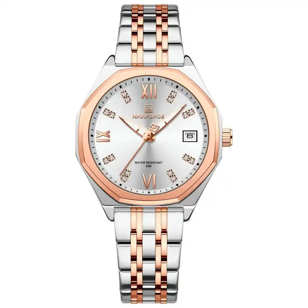 Descubre la elegancia y sofisticación de los relojes **Naviforce**, diseñados para quienes buscan estilo, calidad y funcionalidad en un solo accesorio. Con materiales de primera y un diseño innovador, este reloj no solo complementa tu look, sino que también resalta tu personalidad con un toque de lujo y distinción. Su correa elegante se adapta perfectamente a cualquier ocasión, permitiéndote lucir impecable en todo momento. Más que un simple reloj, **Naviforce** es sinónimo de prestigio y modernidad, ideal para quienes desean destacar con cada detalle. ¡Hazlo tuyo y eleva tu estilo al siguiente nivel! /// El reloj incluye su estuche original y tarjeta de garantía. /// Ficha Técnica Pantalla Análoga Resistencia al agua de 3ATM (solo exposición accidental al agua No ducha, No se puede sumergir, No usar en actividades acuáticas). Tipo de cierre: Hebilla Material de la caja: Aleación de Zinc Grosor de esfera: 1 cm Ancho correa: 1.4cm Diámetro: 3.3 cm Material de la correa banda: Acero Inoxidable Longitud de La correa: 22 cm ( Ajustable ) Peso neto: 69 g Términos de garantía: Para defectos de fábrica o solicitudes de retracto, es importante revisar el producto inmediatamente al recibirlo y antes de usarlo, ya que no aplicará garantía una vez utilizado. Se dispone de un máximo de 5 días para reportar defectos de fábrica, como piezas faltantes o rotas. En el caso de maquinaria, la garantía cubre tres meses para garantizar su correcto funcionamiento. Para efectuar una devolución, el producto debe ser devuelto en su empaque original, en buen estado, con todos los documentos y partes completas y sin daños.